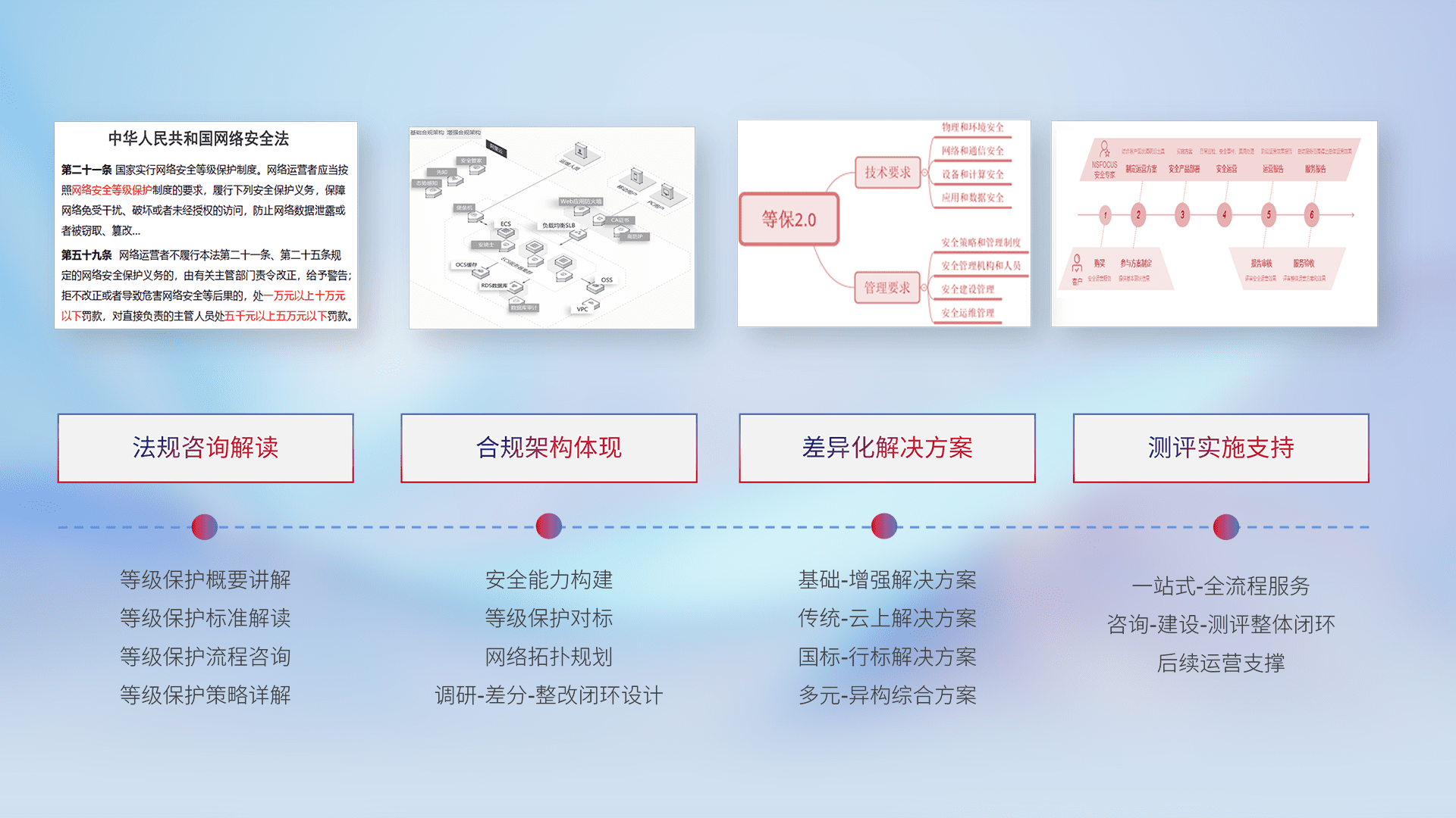 通过专业的法律咨询解读、、、、合规架构体现、、、、差异化解决方案、、、测试实施支持等服务,,为客户量身打造等保合规体系。。。